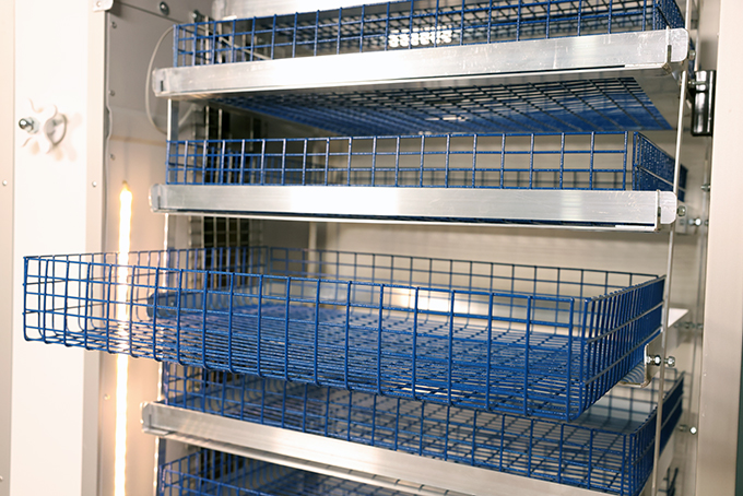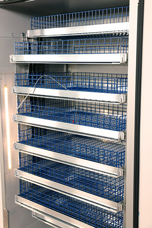 - Автоматический поворот лотков с возможностью изменения угла поворота и интервала времени между переворотами от 30 мин. до 6 часов.