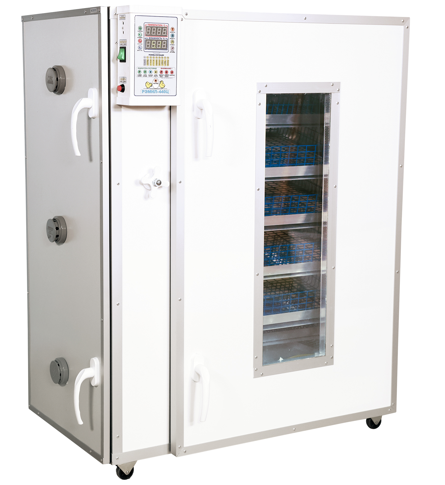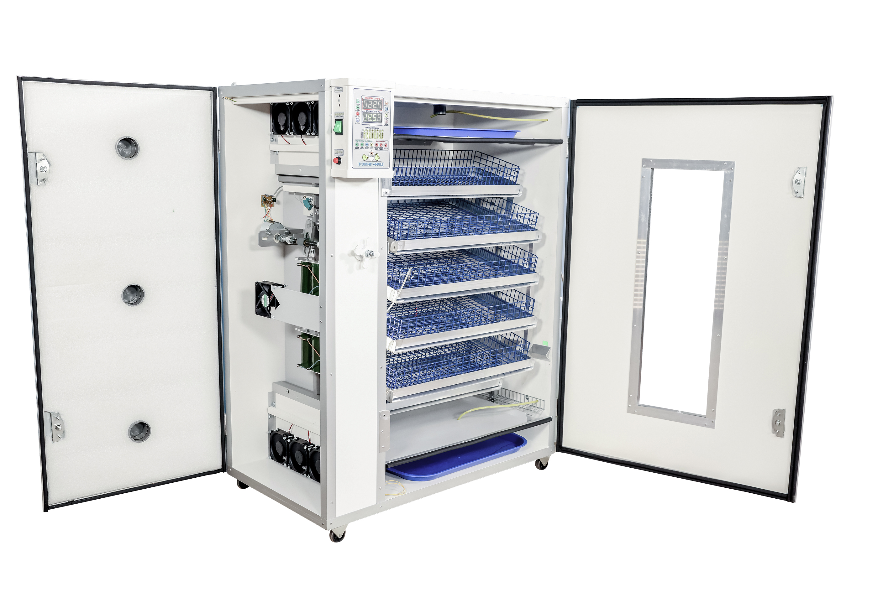 - Автоматический поворот лотков с возможностью изменения угла поворота и интервала времени между переворотами от 30 мин. до 6 часов.