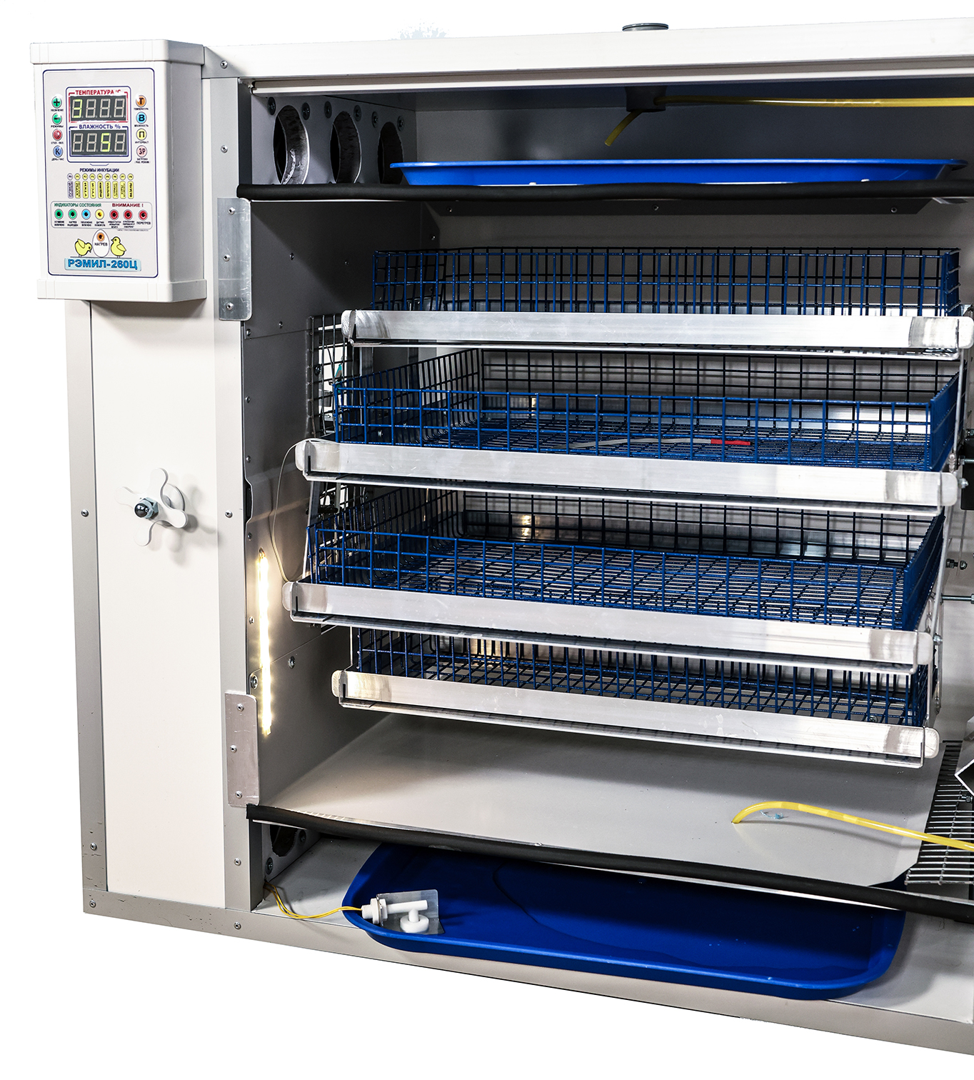 - Инкубатор состоит из инкубационной камеры, внутри которой находятся лотки для размещения яиц, и боковой технической камеры, в которой располагаются вентиляторы, нагревательные элементы, двигатель с механизмом поворота лотков.