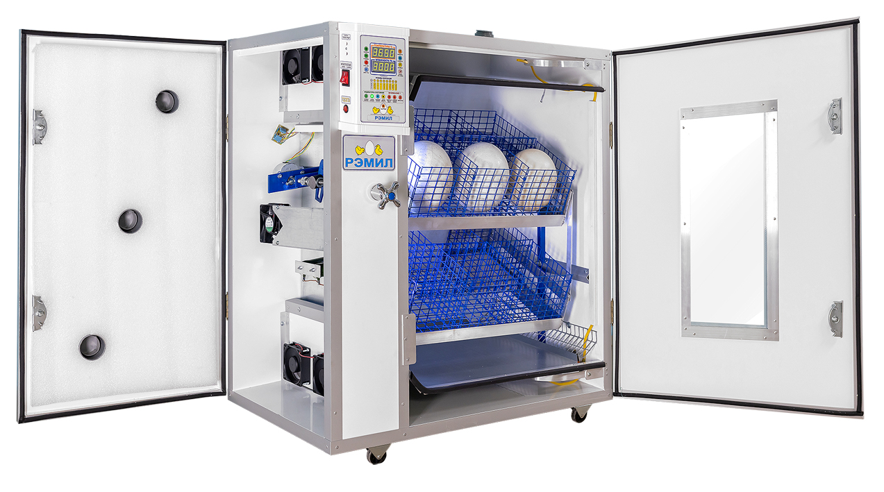 Инкубатор "Рэмил-12Ц" предназначен для инкубирования яиц страусов. Состоит из инкубационной камеры, внутри которой находятся лотки для размещения яиц, и боковой камеры, в которой располагаются все технически узлы и блоки - вентиляторы, нагревательные элементы, двигатель с механизмом поворота.